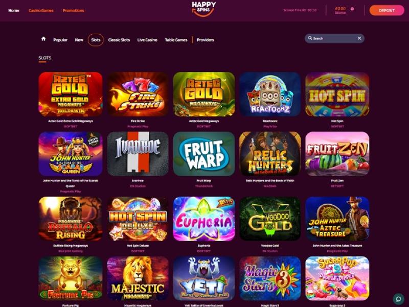 HappySpins هي علامة تجارية يشير اسمها إلى "تدوير" ألعاب السلوتس، ولكن بالنظر إلى القائمة الطويلة لموردي البرامج، فليس من المستغرب أن يقدم هذا الكازينو عبر الإنترنت مجموعة كاملة من ألعاب الكازينو وليس فقط ألعاب الفيديو سلوتس.