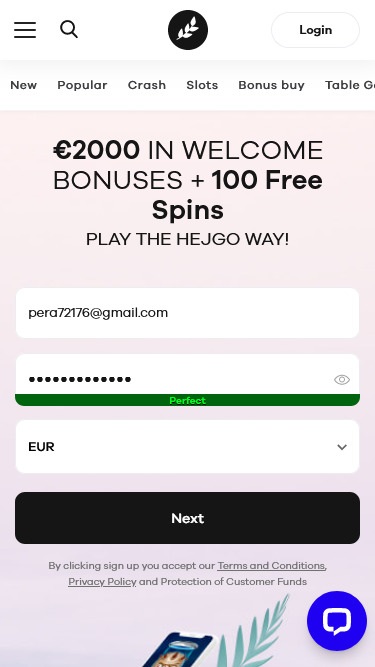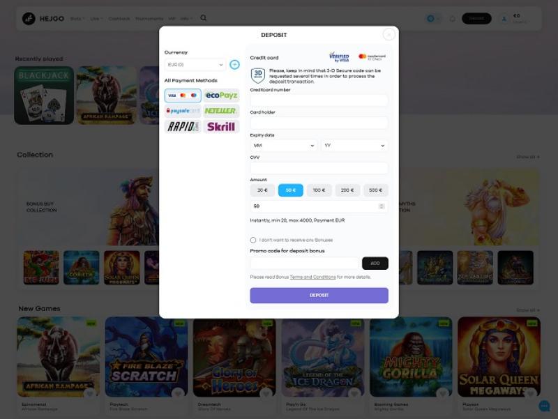 عملية التسجيل سريعة وسهلة. النوافذ المنبثقة تُرشد اللاعبين الجدد مباشرةً خلال عملية التسجيل. بدا لنا أن إتمام التسجيل في Hejgo لم يستغرق وقتًا طويلاً، وفي نهاية هذه العملية البسيطة، عُرض علينا استرداد رمز المكافأة وإيداع مبلغ. هذا الخيار مُفيد لجميع من يتوق لتجربة الألعاب.
