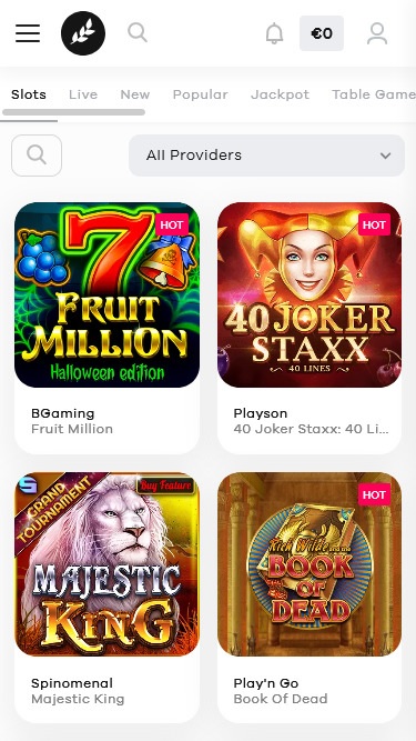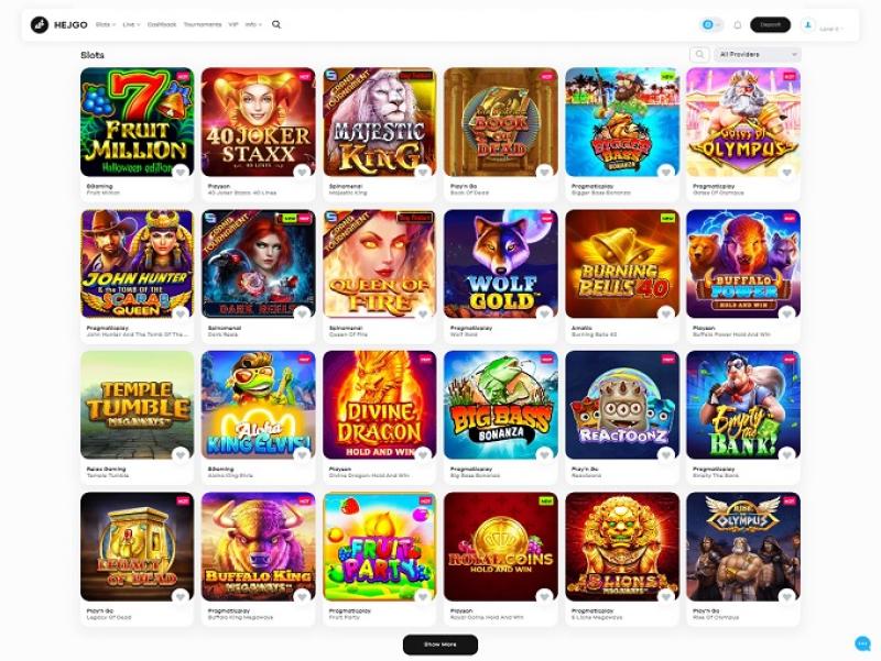 يقدم Hejgo مجموعة كبيرة ومتنوعة من الفتحات ذات السمات الجذابة. العناوين الشائعة هي: Buffalo Power Hold And Win، 40 Joker Staxx: 40 Lines، Book Of Toro، Wolf Power: Hold And Win، Book Of Xmas، Midas Golden Touch، Razor Shark، Vegas Diamonds، Fire In The Hole XBomb، Solar Queen Megaways، Divine Dragon: Hold And Win، African Rampage، Buffalo Power: Christmas، Buffalo Power Megaways، Story Of Vikings، Zorro Wild Heart، Jammin' Jars 2، Royal Coins: Hold And Win، Rise Of Egypt: Deluxe، 7 Fortune Frenzy، Sevens&Fruits: 20 Lines، Wacky Monkey، Lucky Jack Tut's Treasures، Sword Of Khans، Bonanza Billion، Book Of Gold: Classic، Valley Of The Gods، Lady Merlin، Nolimit City، Solar Eclipse، Buffalo Blitz Megaways، Book Of Shadows، Esqueleto Explosivo 2، Santa's Big Bash ميجا وايز، جاكبوت بيلز، أسطورة كليوباترا، كتاب الحقيقة، بومبرز، صعود مصر، جاتور جولد ديلوكس جيجابلوكس، كتاب دوات، 90 ألف ييتي جيجابلوكس، ميجا فاير بليز بيج سيركس...