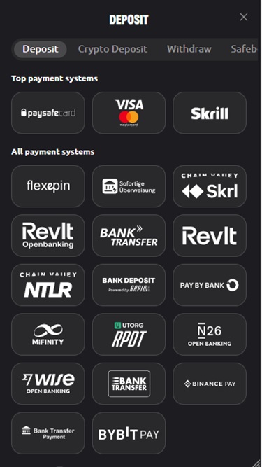 يقدم هذا الكازينو لمستخدميه خيارات مصرفية متعددة للسحب والإيداع. يمكن لمستخدمي الطرق التقليدية الاختيار بين Visa و Mastercard و Neteller و Paysafecard و Skrill و Neosurf و MiFinity و Google Pay و Apple Pay . كما تُعد العملات المشفرة مثل Bitcoin و Cardano و Dogecoin و Polkadot و Ethereum و Litecoin و Solana و Tether و Ripple خيارات فعّالة، حيث توفر عمليات سحب أسرع وبسرية تامة برسوم زهيدة أو معدومة.