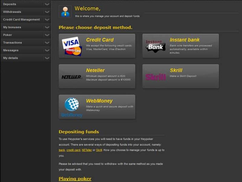 كازينو HeyPoker مدعوم بـ Microgaming, Net Entertainment, Barcrest, Big Time Gaming, ELK Studios, Genesis Gaming, lightningboxgames, Quickspin, Rabcat, Thunderkick, IGT, Games Global, Aristocrat, Bally Technologies, bluberi, Leander Games, NextGen, Ongame, Push Gaming and WMS ، مما يوفر عددًا هائلاً من الألعاب عبر منصة ويب. لا تحتاج إلى تنزيل أي برنامج في HeyPoker، حيث يمكنك لعب جميع الألعاب ببساطة عبر متصفح الويب الخاص بالكازينو. كما يتوفر إصدار محمول من الكازينو لمن يرغب باللعب أثناء التنقل.خيارات الخدمات المصرفية في Heypoker Casino