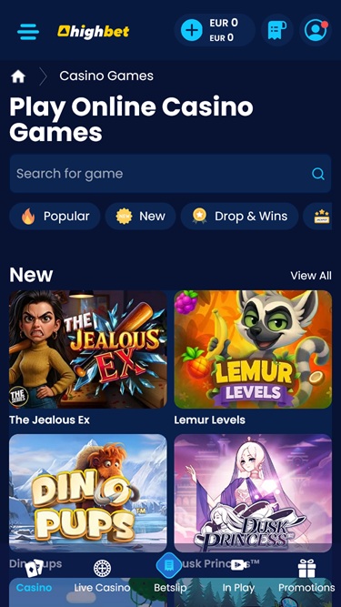 يتعاون المُشغّل مع مُطوّري برامج كازينوهات الإنترنت المشهورين الذين يُزوّدون Highbet بمجموعة كاملة من ألعاب الكازينو. وتضم قائمة مُزوّدي الألعاب لدى الكازينو العديد من الأسماء المعروفة (Evolution Gaming، Ezugi، NetEnt، Microgaming، Yggdrasil...).