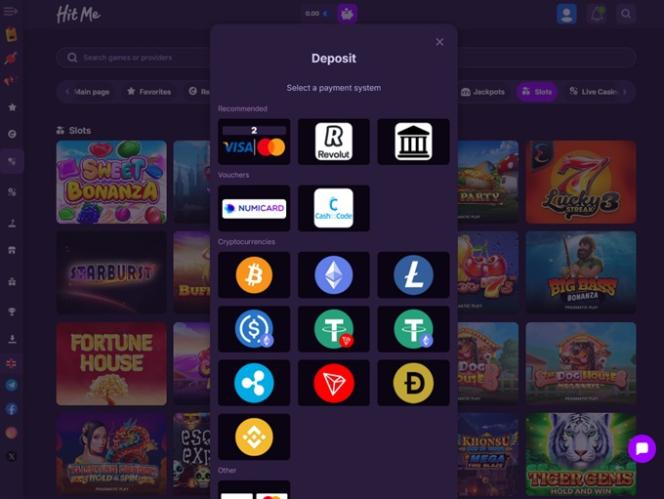 كازينو هيت مي بت هو كازينو إلكتروني يعتمد بشكل أساسي على العملات المشفرة، ما يعني أنه يمكن للاعبين استخدام العديد من العملات المشفرة لإيداع وسحب أموالهم. من بين الخيارات المتاحة بيتكوين ، وبيتكوين كاش ، ودوجكوين ، وإيثريوم ، وترون ، وتيثر ، وريبل . كما يقبل الموقع طرق الدفع التقليدية مثل التحويلات البنكية ، وريفولوت ، وإنتراك .