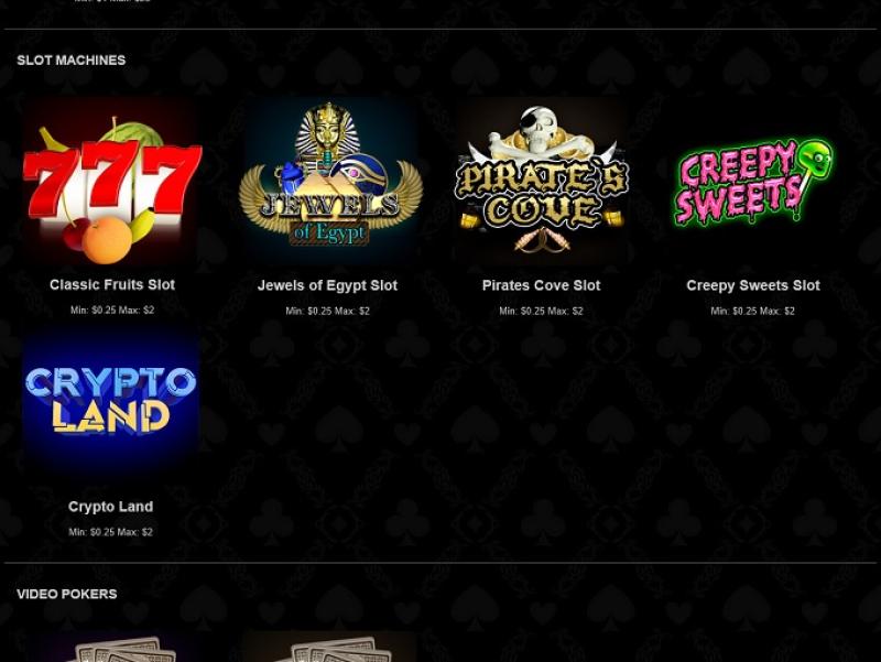 الألعاب المتاحة هي: Blackjack، 777، Jacks or Better VP، American Roulette، Craps Vegas Casino، Jewels of Egypt، Baccarat، Beat the Bookie، Deuces Wild، Pirate's Cove، و Creepy Sweets.