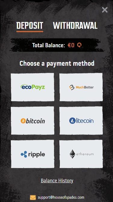 على الرغم من أن أمين الصندوق في كازينو House Of Spades يعتمد على البلد، إلا أنه يدعم طرق دفع مختلفة بما في ذلك خيارات الخدمات المصرفية بالعملة المشفرة بغض النظر عن الولاية القضائية للمقامرة التي أتيت منها.