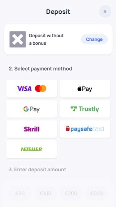 من بين الخيارات المتاحة للاعبين لإجراء عمليات الإيداع والسحب: Apple Pay وGoogle Pay وبطاقات الدفع الشائعة والمحافظ الإلكترونية مثل Neteller وSkrill وRevolut وغيرها من الخدمات المصرفية. يُرجى العلم أن بعضها قد لا يكون متاحًا في منطقتك، نظرًا لاختلاف خيارات الدفع باختلاف البلد، وفي بعض الولايات القضائية، قد لا تتوفر بعض خيارات الدفع للمقامرة عبر الإنترنت.