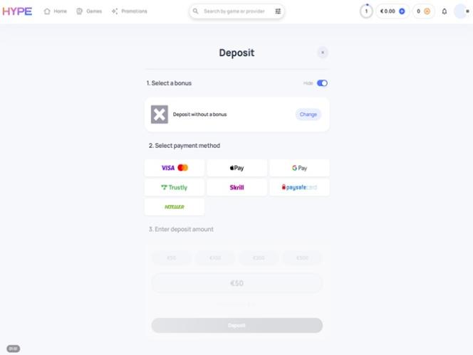 - العملة الرئيسية في كازينو Hype هي اليورو.