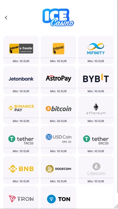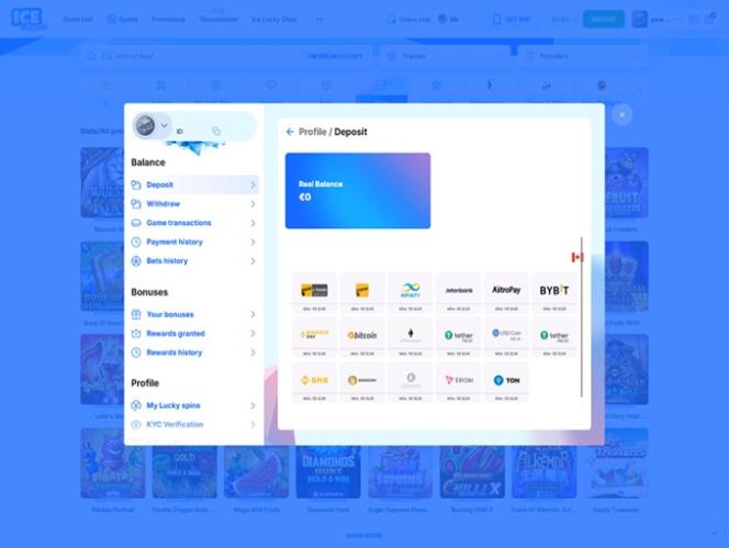 يعمل كازينو IceCasino بواسطة Net Entertainment, Playtech, BetSoft, 1x2gaming, Amatic Industries, ELK Studios, Evolution Gaming, Ezugi, Habanero Systems, iSoftBet, Novomatic, Oryx, Play'n GO, Quickspin, Relax Gaming, Thunderkick, Yggdrasil, Endorphina, Booming Games, PlayPearls, Stakelogic, Pragmatic Play, Nolimit City, Felt Gaming, Red Tiger Gaming, LuckyStreak, Spinomenal, Felix Gaming, Fugaso, Belatra Games, FunFair, Kalamba, Mobilots, Platipus Gaming, Nucleus Gaming, BGAMING, Fazi, Evoplay, OneTouch, Pocket Games Soft, Bulletproof Games, CQ9 Gaming, Mascot Gaming, TVBet, NetGame Entertainment, Spearhead Studios, Swintt, TrueLab Games, Mancala Gaming, 7Mojos, SmartSoft Gaming, Atmosfera, Blue Guru Games, Lady Luck Games, Holle Games, Eurasian Gaming, Games Global, Amusnet Interactive, bluberi, Blueprint Gaming, CT Interactive, Greentube, Igrosoft, Push Gaming, Tom Horn Gaming, Gamomat, Mr Slotty, Reel Time Gaming, Zitro, Reflex Gaming, Wild Streak Gaming, Golden Hero, 4ThePlayer, AvatarUX, High 5 Games, Groove Gaming, ReelPlay, Japan Technicals Games, Black Pudding Games, Hacksaw Gaming, Bang Bang Games, Gamzix, Arcadem, Peter And Sons, Absolute Live Gaming, Lucksome Gaming, Gamebeat, TaDa Gaming, Amigo Gaming, Apparat Gaming, Spribe, 1spin4win, 5Men Gaming, Bet2Tech, Atomic Slot Lab, Givme Games, Indigo Magic, Popiplay, Zillion Games and Playzia ، وتُقدم ألعابه عبر منصة ويب تتيح اللعب عبر متصفح الإنترنت. كما يتوفر موقع للهواتف المحمولة، ما يتيح لك اللعب عبر هاتفك الذكي أو جهازك اللوحي.خيارات الخدمات المصرفية في IceCasino