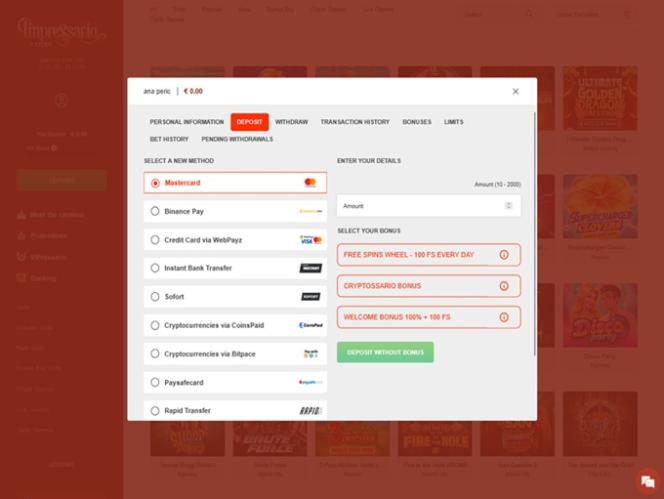 يُعدّ توفير طرق الدفع من أهم أولويات موقع المقامرة هذا. يمكن للاعبين استخدام العديد من طرق الإيداع والسحب، مثل Visa و Mastercard و Skrill و Neteller وMiFinity و Paysafecard و Cashlib وغيرها، بالإضافة إلى العديد من العملات المشفرة مثل Bitcoin و Bitcoin Cash و Cardano و Dogecoin و Ethereum و Litecoin و Solana وTron و Tether و USD Coin و Ripple .