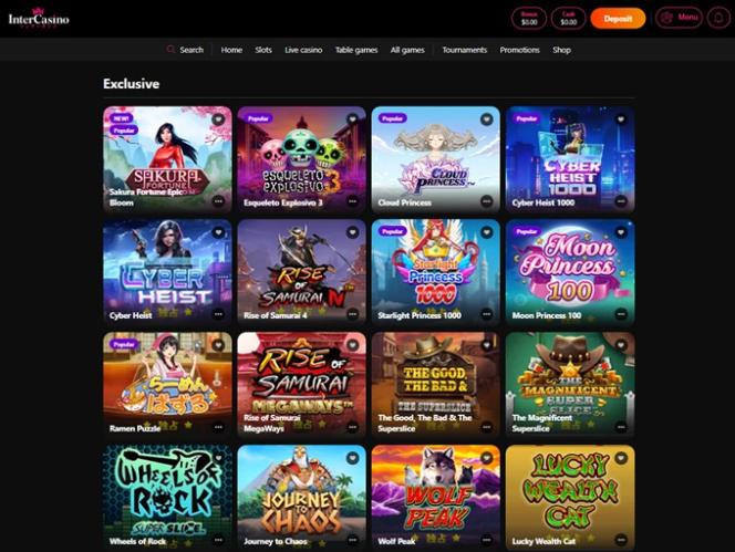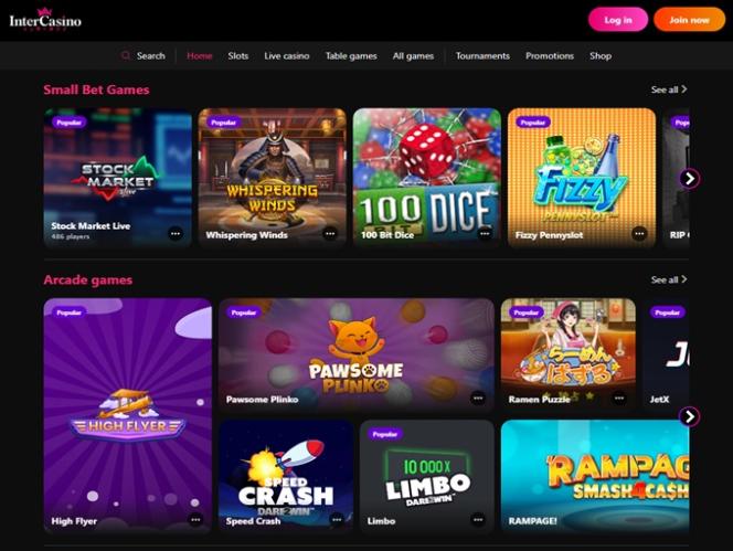 يعمل InterCasino بنظام Amaya, Microgaming, Net Entertainment, Playtech, 1x2gaming, Barcrest, Big Time Gaming, ELK Studios, Evolution Gaming, EYECON, Ezugi, Habanero Systems, iSoftBet, lightningboxgames, Oryx, Play'n GO, Quickspin, Rabcat, Relax Gaming, Thunderkick, Yggdrasil, Wazdan, Realistic Games, Booming Games, Stakelogic, Pragmatic Play, Nolimit City, Red Tiger Gaming, Fantasma Games, Kalamba, Spin Games, Skywind, Triple Edge Studios, Northern Lights Gaming, Evoplay, Stormcraft Studios, OneTouch, Electric Elephant Games, Pocket Games Soft, Triple PG, Bulletproof Games, All41 Studios, Gameburger Studios, Pulse 8 Studios, Slot Factory, Neon Valley Studios, Shuffle Master, SpinPlay Games, HungryBear Gaming, SmartSoft Gaming, Blue Guru Games, Buck Stakes Entertainment, Games Global, Bally Technologies, bluberi, Endemol Games, Leander Games, NextGen, NYX Interactive, Push Gaming, Tom Horn Gaming, WMS, Gaming Realms, SG Interactive, Gamomat, Red7Mobile, CORE Gaming, Scientific Games, Side City Studios, Iron Dog Studio, Foxium, Betdigital, Just For The Win, Reflex Gaming, PearFiction Studios, Wild Streak Gaming, Slingshot Studios, Fortune Factory Studios, Jade Rabbit Gaming, STHLM Gaming, 4ThePlayer, AvatarUX, Gamevy, Crazy Tooth Studio, Pirates Gold Studios, ReelPlay, Japan Technicals Games, Alchemy Gaming, Snowborn Games, Boomerang Studios, Hacksaw Gaming, Max Win Gaming, Gold Coin Studios, Bang Bang Games, Slotmill, SilverBack Gaming, Peter And Sons, Aurum Signature Studios, Area Vegas, RAW iGaming, Leap Gaming, Wishbone Games, Spribe, Print Studios, Gaming Corps, Four Leaf Gaming, INO Games, Nailed It! Games, Atomic Slot Lab, Neko Games, Reel Kingdom, Oros Gaming, Indigo Magic, Light & Wonder and Live88 ، مما يوفر لعملائه مجموعة واسعة من الألعاب. تتوفر الألعاب مباشرةً عبر متصفح الويب، حيث لا يتطلب التسجيل والإيداع واللعب أي تنزيل.