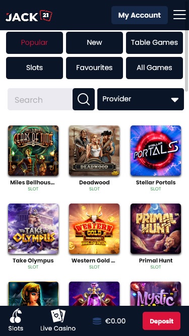كازينو Jack21 مدعوم من Microgaming, Net Entertainment, BetSoft, 1x2gaming, Big Time Gaming, ELK Studios, Evolution Gaming, Ezugi, Genesis Gaming, Habanero Systems, iSoftBet, Oryx, Play'n GO, playson, Quickspin, Rabcat, Relax Gaming, Thunderkick, Vivo Gaming, Yggdrasil, Endorphina, Wazdan, GameArt, Betgames, Booming Games, Pragmatic Play, Nolimit City, Red Tiger Gaming, Spinomenal, Fugaso, Kalamba, Triple Edge Studios, Northern Lights Gaming, Evoplay, Stormcraft Studios, Switch Studios, OneTouch, Pocket Games Soft, Triple PG, All41 Studios, Gameburger Studios, Pulse 8 Studios, Neon Valley Studios, Golden Rock Studios, SpinPlay Games, Caleta Gaming, Games Global, Amusnet Interactive, Wizard Games, 2by2 Gaming, Blueprint Gaming, Pariplay, Push Gaming, Tom Horn Gaming, Gamomat, Xplosive Slots, Reel Time Gaming, BF Games, betiXon, HollywoodTV, Ganapati, Iron Dog Studio, Old Skool Studios, Foxium, Just For The Win, Slingshot Studios, Fortune Factory Studios, 4ThePlayer, AvatarUX, SlotVision, Alchemy Gaming, Snowborn Games, Hacksaw Gaming, Half Pixel Studios, Eurostar Studios and PlayAce ، ويستخدم الموقع منصةً إلكترونيةً لتوزيع ألعابه. يتميز الموقع بتصميمه الرائع وسهولة تصفحه، ولم أواجه أي صعوبة في العثور على الألعاب التي أرغب في لعبها. يدعم Jack21 الهواتف المحمولة، ما يتيح لك اللعب عبر هاتفك الذكي أو جهازك اللوحي.المقامرة المسؤولة ودعم العملاء والأمان