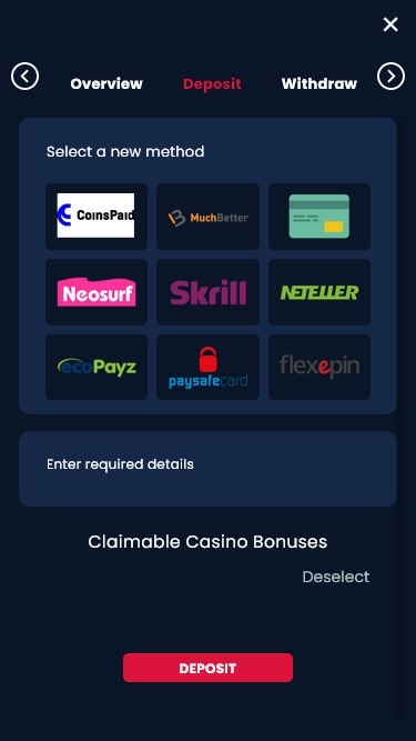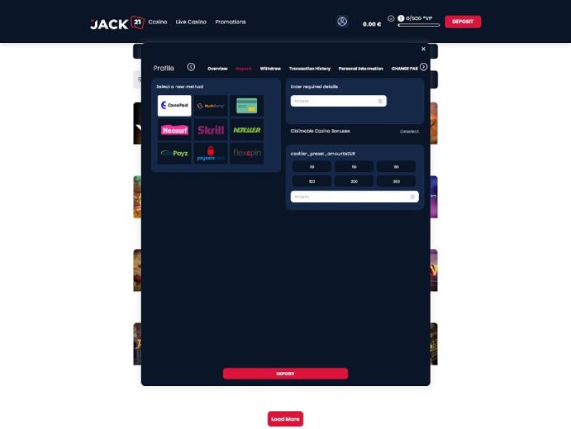 الشروط والأحكام متوسطة إلى حد ما، ولا يوجد شيء بارز على أنه غير عادل أو مفترس تجاه اللاعبين.ستجد هنا خيارات الخدمات المصرفية المختلفة المتاحة في Jack21Casino، بما في ذلك خيارات الإيداع والسحب.