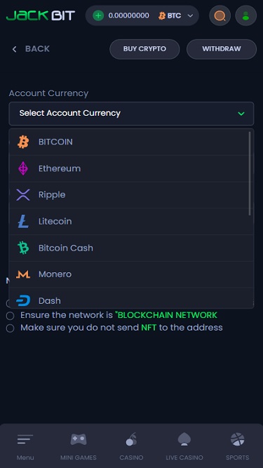 كما ذكرنا سابقًا، يدعم كازينو Jackbit العديد منالعملات المشفرة الشهيرةومدفوعات العملات المشفرة .