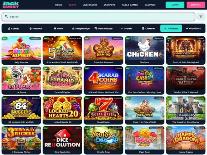 يقع JackBurst في الفئة الذهبية المتوسطة من الكازينوهات على الإنترنت، مما يعني أنه لا يوجد وفرة من الشركات الشهيرة التي تدعم محفظة منتجاته، ولكن مع قائمة تضم أكثر من 60 اسمًا، فإنه يمثل منصة متزامنة للغاية في مجال ألعاب الإنترنت: Net Entertainment, BetSoft, 1x2gaming, Big Time Gaming, Evolution Gaming, Ezugi, Habanero Systems, iSoftBet, Play'n GO, playson, Relax Gaming, Thunderkick, Yggdrasil, Endorphina, Wazdan, Booming Games, Pragmatic Play, Nolimit City, Red Tiger Gaming, Booongo, Red Rake Gaming, Kalamba, Triple Edge Studios, Northern Lights Gaming, Fazi, Evoplay, Stormcraft Studios, Pocket Games Soft, Bulletproof Games, All41 Studios, Gluck Games, Gameburger Studios, Neon Valley Studios, HungryBear Gaming, Buck Stakes Entertainment, Games Global, Reevo, Amusnet Interactive, Blueprint Gaming, Gamomat, Reel Time Gaming, BF Games, Bally Wulff, Iron Dog Studio, Foxium, Just For The Win, Reflex Gaming, PearFiction Studios, Fortune Factory Studios, STHLM Gaming, 4ThePlayer, AvatarUX, Gamevy, Crazy Tooth Studio, Alchemy Gaming, Boomerang Studios, Hacksaw Gaming, Bang Bang Games, Peter And Sons, Aviatrix, 3 Oaks Gaming, Spribe, Atomic Slot Lab, Reel Kingdom, Galaxsys, Kitsune Studios and Penguin King