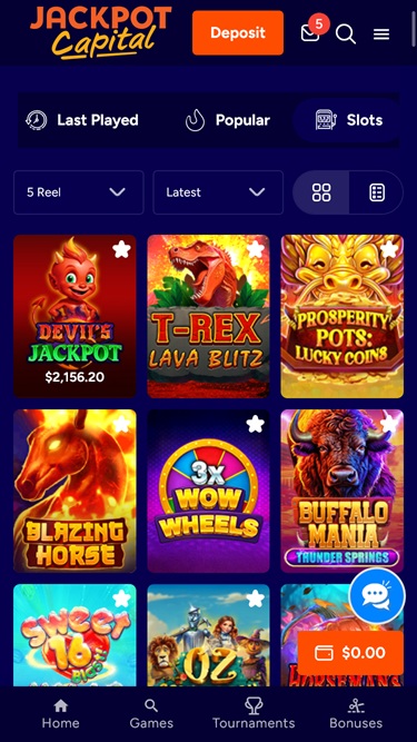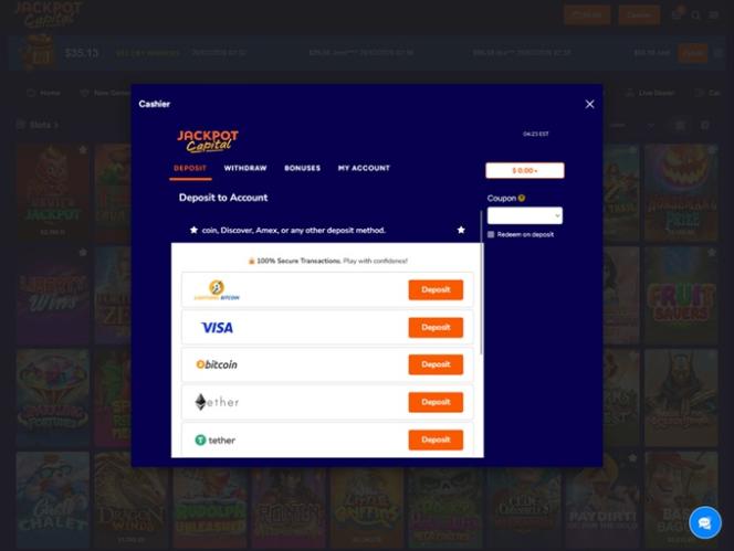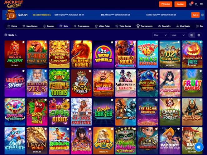 كازينو جاكبوت كابيتال مدعوم من Real Time Gaming and Visionary iGaming ، الذي يوفر لعملائه عشرات الألعاب المناسبة للولايات المتحدة. يتوفر الكازينو عبر منصة ويب، بالإضافة إلى برنامج قابل للتنزيل، يتيح لك تثبيت جميع ألعاب الكازينو على جهاز الكمبيوتر الخاص بك.