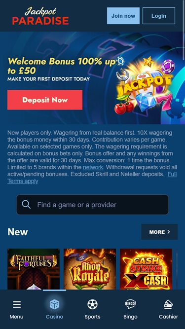 يتم تشغيل Jackpot Paradise Casino بواسطة Microgaming, Net Entertainment, Playtech, 1x2gaming, Barcrest, Big Time Gaming, ELK Studios, Evolution Gaming, EYECON, lightningboxgames, Novomatic, Play'n GO, Quickspin, Rabcat, Thunderkick, Wazdan, Pragmatic Play, Nolimit City, Red Tiger Gaming, Spinomenal, Fugaso, SYNOT Games, Skywind, Triple Edge Studios, Northern Lights Gaming, Stormcraft Studios, Switch Studios, All41 Studios, Gluck Games, Gameburger Studios, Pulse 8 Studios, Slot Factory, Neon Valley Studios, Shuffle Master, SpinPlay Games, Real Dealer Studios, GONG Gaming, On Air Entertainment, Buck Stakes Entertainment, Games Global, Ash Gaming, Blueprint Gaming, Greentube, NextGen, ProgressPlay, Tom Horn Gaming, WMS, Inspired Gaming, SG Interactive, Red7Mobile, CORE Gaming, Scientific Games, Reel Time Gaming, BF Games, Iron Dog Studio, Old Skool Studios, Betdigital, Just For The Win, PearFiction Studios, Wild Streak Gaming, Slingshot Studios, Fortune Factory Studios, Gamevy, Crazy Tooth Studio, Alchemy Gaming, Rarestone Gaming, Black Pudding Games, Snowborn Games, Hacksaw Gaming, Max Win Gaming, Gold Coin Studios, Half Pixel Studios, Aurum Signature Studios, Lucksome Gaming, Area Vegas, Wishbone Games, Circular Arrow, HammerTime Games, INO Games, Nailed It! Games, Neko Games, Reel Kingdom, Oros Gaming and Light & Wonder ، ويتم توفير ألعابه من خلال منصة تعتمد على الويب بالإضافة إلى موقع محمول يسمح باللعب عبر الهواتف الذكية والأجهزة اللوحية.Blackjack