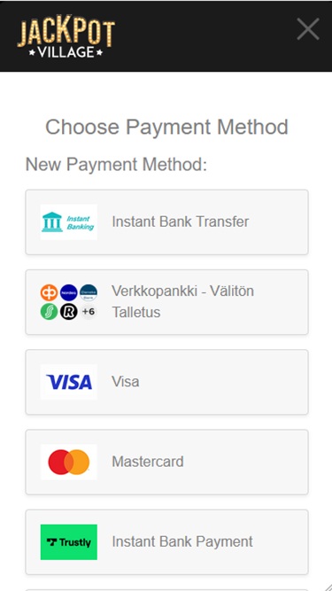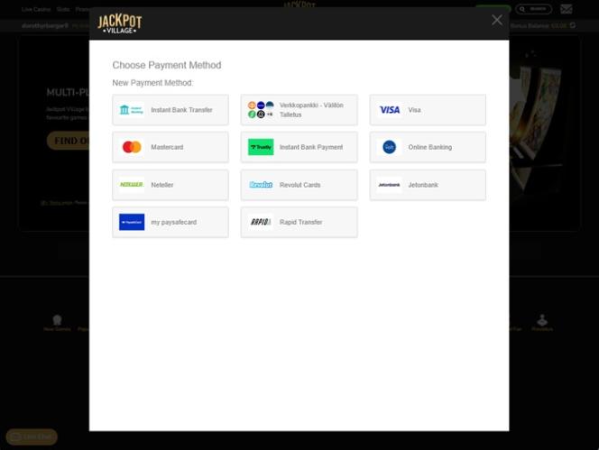 إذا كنت من اللاعبين الذين تحولوا تمامًا إلى التعاملات المصرفية في كازينوهات العملات المشفرة، فقد تشعر بخيبة أمل بعض الشيء، لأن كازينو Jackpot Village لا يدعم العملات المشفرة. مع ذلك، تتوفر العديد من الخيارات الأخرى، بما في ذلك بطاقات الخصم والائتمان، والمحافظ الإلكترونية مثل Skrill و PayPal ، والتحويلات البنكية، وغيرها من أنظمة الدفع الشائعة. أوقات السحب متوسطة.