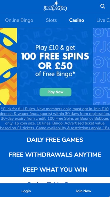 تمنح JackpotJoy نقطة مجانية واحدة لكل 20 جنيهًا إسترلينيًا تُراهن بها في ألعاب الكازينو، أو نقطة واحدة لكل 5 جنيهات إسترلينية تُشترى في بطاقات البنغو. يمكن استبدال النقاط في Shop of Joy نقدًا أو في سحوبات الجوائز.