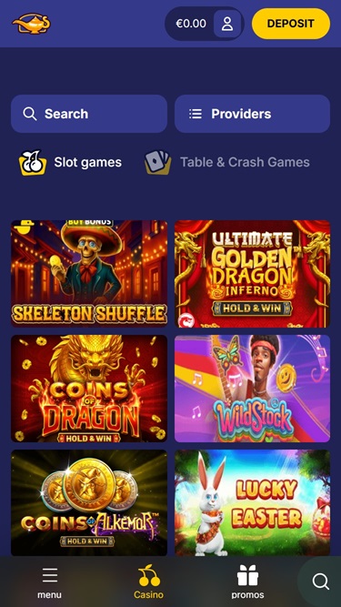 بالنقر على زر الكازينو في رأس الموقع، ستفتح مجموعة الألعاب الكاملة التي تأتي مقسمة إلى عدة أقسام فرعية مثل ماكينات القمار، وألعاب الطاولة، والألعاب الافتراضية، وكراش، وما إلى ذلك. ولتجربة أكثر سلاسة، هناك أيضًا العديد من الفلاتر القابلة للتعديل وشريط بحث على الجانب الأيمن من شاشتك.