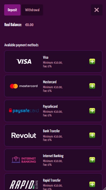 من المهم ملاحظة أن جميع خيارات الدفع تختلف باختلاف البلد، مما يعني أنه حتى لو توفرت إحدى هذه الخيارات على هذا الموقع، فقد لا تكون متاحة في نطاق اختصاص المقامرة الخاص بك. لهذا السبب، تأكد من مراجعة قسم الدفع قبل إجراء الإيداعات أو السحب!