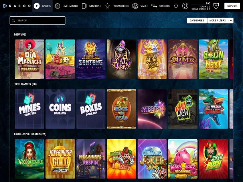 يتم تشغيل كازينو Kaboo بواسطة Microgaming, Net Entertainment, BetSoft, 1x2gaming, Barcrest, Big Time Gaming, ELK Studios, Evolution Gaming, lightningboxgames, Novomatic, Oryx, Play'n GO, Quickspin, Rabcat, Relax Gaming, Thunderkick, Yggdrasil, Stakelogic, Pragmatic Play, Nolimit City, Red Tiger Gaming, Skillzzgaming, Fantasma Games, Kalamba, Triple Edge Studios, Northern Lights Gaming, Stormcraft Studios, Electric Elephant Games, Bulletproof Games, All41 Studios, Gluck Games, Gameburger Studios, Neon Valley Studios, Golden Rock Studios, Spearhead Studios, Shuffle Master, SpinPlay Games, Blue Guru Games, Lady Luck Games, Games Global, 2by2 Gaming, Bally Technologies, bluberi, Blueprint Gaming, Greentube, NextGen, Push Gaming, WMS, Gaming Realms, Cayetano, SG Interactive, Gamomat, Red7Mobile, Scientific Games, Side City Studios, Reel Time Gaming, Authentic Gaming, Iron Dog Studio, Old Skool Studios, Foxium, Betdigital, Just For The Win, Reflex Gaming, PearFiction Studios, Wild Streak Gaming, Slingshot Studios, Fortune Factory Studios, STHLM Gaming, 4ThePlayer, AvatarUX, Gamevy, High 5 Games, ReelPlay, Alchemy Gaming, Black Pudding Games, Snowborn Games, Boomerang Studios, Hacksaw Gaming, Max Win Gaming, Gold Coin Studios, Bang Bang Games, Half Pixel Studios, SilverBack Gaming, Peter And Sons, Eurostar Studios, Aurum Signature Studios, Lucksome Gaming, Area Vegas, Circular Arrow, Bet2Tech and Four Leaf Gaming ، ويتم توفير ألعاب الكازينو من خلال منصة تعتمد على الويب تتيح لك اللعب دون تنزيل أي برنامج.