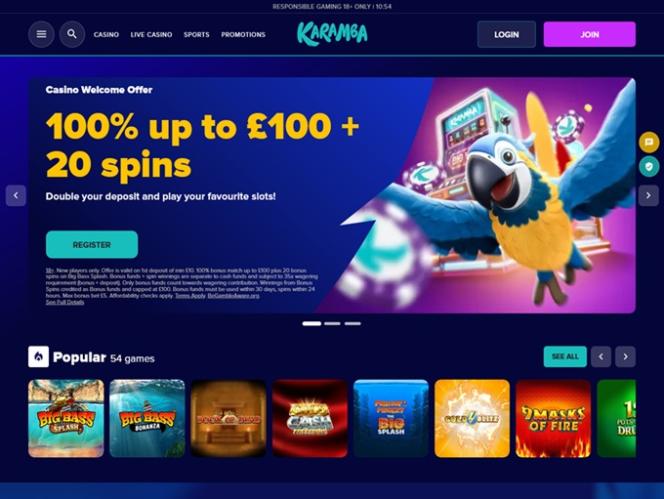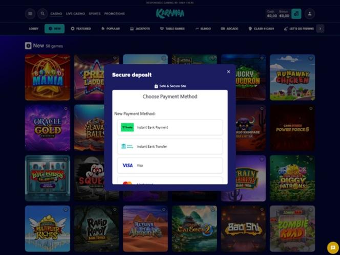 كازينو كارامبا مُشغّل بواسطة Microgaming, Net Entertainment, 1x2gaming, Barcrest, Big Time Gaming, ELK Studios, Evolution Gaming, EYECON, Ezugi, lightningboxgames, Oryx, Play'n GO, Relax Gaming, Thunderkick, Realistic Games, Stakelogic, Pragmatic Play, Red Tiger Gaming, IGT, Spinomenal, Red Rake Gaming, Fantasma Games, FunFair, SYNOT Games, Revolver Gaming, Skywind, Spinmatic, Triple Edge Studios, BGAMING, Northern Lights Gaming, Stormcraft Studios, Switch Studios, Pocket Games Soft, All41 Studios, Gluck Games, Gameburger Studios, Neon Valley Studios, Golden Rock Studios, Shuffle Master, SpinPlay Games, HungryBear Gaming, KA Gaming, GONG Gaming, Blue Guru Games, Buck Stakes Entertainment, Design Works Gaming, Games Global, Bally Technologies, Blueprint Gaming, Endemol Games, Leander Games, Merkur Gaming, NextGen, NYX Interactive, Push Gaming, Tom Horn Gaming, WMS, Inspired Gaming, Gaming Realms, SG Interactive, Red7Mobile, Scientific Games, Side City Studios, Reel Time Gaming, Bally Wulff, Iron Dog Studio, Foxium, Betdigital, Just For The Win, Storm Gaming Technology, PearFiction Studios, Wild Streak Gaming, Slingshot Studios, Fortune Factory Studios, 4ThePlayer, AvatarUX, Gamevy, Crazy Tooth Studio, ReelPlay, AGS Interactive, Alchemy Gaming, Black Pudding Games, Snowborn Games, Boomerang Studios, Gold Coin Studios, Bang Bang Games, Half Pixel Studios, Slotmill, Peter And Sons, Aurum Signature Studios, Lucksome Gaming, Area Vegas, RAW iGaming, Wishbone Games, Spribe, Print Studios, HammerTime Games, Four Leaf Gaming, INO Games, Nailed It! Games, Neko Games, Reel Kingdom, Oros Gaming and Light & Wonder ، مما يمنحه مكتبة ألعاب سلوتس واسعة. يعمل الكازينو عبر منصة ويب، ما يعني أنك تُسجّل الدخول وتلعب مباشرةً عبر متصفح الويب بدلاً من تنزيل أي برنامج على جهازك. كما يتوفر موقع جوال لمن يرغب باللعب أثناء التنقل.خيارات الخدمات المصرفية في Karamba