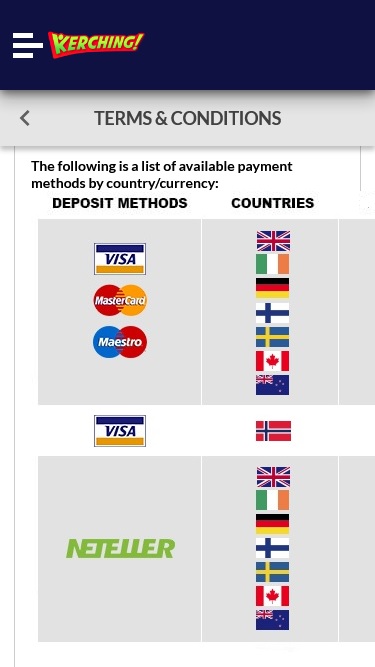 لا يقبل موقع Kerching Casino اللاعبين من البلدان التالية: أفغانستان, ألاباما, جزر آلاند, ألاسكا, ألبانيا, ألبرتا, ألديرني, الجزائر, ساموا الأمريكية, أندورا, أنغولا, أنغيلا, القارة القطبية الجنوبية, أنتيغوا وباربودا, الأرجنتين, أريزونا, أركنساس, أرمينيا, أروبا, أستراليا, النمسا, أذربيجان, جزر البهاما, البحرين, بنغلاديش, بربادوس, بيلاروسيا, بلجيكا, بليز, بنين, برمودا, بوتان, بوليفيا, البوسنة والهرسك, بوتسوانا, جزيرة بوفيت, البرازيل, كولومبيا البريطانية, إقليم المحيط الهندي البريطاني, بروناي, بلغاريا, بوركينا فاسو, بوروندي, كاليفورنيا, كمبوديا, الكاميرون, كندا, الرأس الأخضر, جزر كايمان, جمهورية أفريقيا الوسطى, تشاد, تشيلي, الصين, جزيرة الكريسماس, جزر كوكوس (كيلينغ), كولومبيا, كولورادو, جزر القمر, الكونغو, جمهورية الكونغو الديمقراطية, كونيتيكت, جزر كوك, كوستاريكا, ساحل العاج, كرواتيا, كوبا, كوراساو, قبرص, الجمهورية التشيكية, دي سي, ديلاوير, الدنمارك, جيبوتي, دومينيكا, جمهورية الدومينيكان, الإكوادور, مصر, السلفادور, غينيا الاستوائية, إريتريا, إستونيا, أثيوبيا, جزر فوكلاند (مالفيناس), جزر فارو, فيجي, فنلندا, فلوريدا, فرنسا, غيانا الفرنسية, بولينيزيا الفرنسية, الأقاليم الجنوبية الفرنسية, الجابون, غامبيا, جورجيا, جورجيا, ألمانيا, غانا, جبل طارق, اليونان, جرينلاند, غرينادا, غوادلوب, غوام, غواتيمالا, غينيا, غينيا بيساو, غيانا, هايتي, هاواي, جزيرة هيرد وجزر ماكدونالد, هندوراس, هونغ كونغ, هنغاريا, أيسلندا, أيداهو, إلينوي, الهند, إنديانا, أندونيسيا, أيوا, إيران, العراق, أيرلندا, جزيرة مان, إسرائيل, إيطاليا, جامايكا, اليابان, جيرسي, الأردن, كانساس, كازاخستان, كنتاكي, كينيا, كيريباتي, كوريا، جمهورية كوريا الديمقراطية الشعبية, جمهورية كوريا, الكويت, قيرغيزستان, لاوس, لاتفيا, لبنان, ليسوتو, ليبيريا, ليبيا, ليختنشتاين, ليتوانيا, لويزيانا, لوكسمبورغ, ماكاو, مدغشقر, مين, ملاوي, ماليزيا, جزر المالديف, مالي, مالطا, مانيتوبا, جزر مارشال, مارتينيك, ماريلاند, ماساتشوستس, موريتانيا, موريشيوس, مايوت, المكسيك, ميشيغان, ميكرونيزيا، ولايات الاتحاد, مينيسوتا, ميسيسيبي, ميسوري, مولدوفا, موناكو, منغوليا, مونتانا, الجبل الأسود, مونتسيرات, المغرب, موزمبيق, ميانمار, ناميبيا, ناورو, نبراسكا, نيبال, هولندا, جزر الأنتيل الهولندية, نيفادا, نيو برونزويك, كاليدونيا الجديدة, نيو هامبشاير, نيوجيرسي, نيو مكسيكو, نيويورك, نيوزيلندا, نيوفاوندلاند ولابرادور, نيكاراغوا, النيجر, نيجيريا, نيوي, جزيرة نورفولك, كارولينا الشمالية, داكوتا الشمالية, مقدونيا الشمالية, جزر ماريانا الشمالية, الأقاليم الشمالية الغربية, النرويج, نوفا سكوشا, نونافوت, أوهايو, أوكلاهوما, عُمان, أونتاريو, أوريغون, باكستان, قصر, فلسطين, بنما, بابوا غينيا الجديدة, باراغواي, بنسلفانيا, بيرو, فيلبيني, بيتكيرن, بولندا, البرتغال, جزيرة الأمير إدوارد, بورتوريكو, قطر, كيبيك, جمع شمل, رود آيلاند, رومانيا, روسيا, رواندا, سانت هيلينا, سانت كيتس ونيفيس, سانت لوسيا, سانت مارتن, سان بيير وميكلون, سانت فنسنت وجزر غرينادين, ساموا, سان مارينو, ساو تومي وبرينسيبي, ساسكاتشوان, المملكة العربية السعودية, السنغال, صربيا, سيشل, سيراليون, سنغافورة, سلوفاكيا, سلوفينيا, جزر سليمان, الصومال, جنوب أفريقيا, كارولينا الجنوبية, داكوتا الجنوبية, جورجيا الجنوبية وجزر ساندويتش الجنوبية, جنوب السودان, إسبانيا, سريلانكا, السودان, سورينام, سفالبارد ويان ماين, سوازيلاند, السويد, سويسرا, سوريا, تايوان, طاجيكستان, تنزانيا, تينيسي, تكساس, تايلاند, تيمور الشرقية, توغو, توكيلاو, وصل, ترينيداد وتوباغو, تونس, ديك رومى, تركمانستان, جزر تركس وكايكوس, توفالو, أوغندا, أوكرانيا, الإمارات العربية المتحدة, الولايات المتحدة, جزر الولايات المتحدة الصغيرة النائية, أوروغواي, يوتا, أوزبكستان, فانواتو, الفاتيكان, فنزويلا, فيرمونت, فيتنام, جزر ف