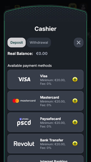 سررنا لأن العلامة التجارية تتيح للاعبين استخدام العديد من طرق الدفع، بما في ذلك فيزا ، وماستركارد ، وسكريل ، ونتلر ، والتحويل البنكي ، وباي سيف كارد ، وجيتون ، ونيو سيرف ، وغيرها. علاوة على ذلك، يمكن للاعبين إيداع وسحب أموالهم باستخدام العملات المشفرة مثل بيتكوين ، وبيتكوين كاش ، وكاردانو ، ودوجكوين ، وإيثريوم ، ولايتكوين ، و USD Coin ، وتيثر ، وريبل .