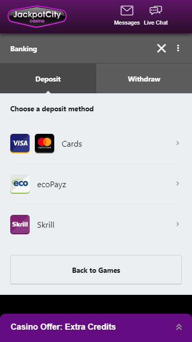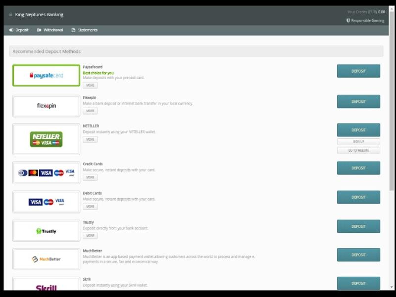 يتم تشغيل King Neptune's Casino بواسطة Microgaming, Evolution Gaming and Games Global ، والذي يوفر عدة مئات من الألعاب من خلال برنامج قابل للتنزيل بالإضافة إلى منصة تعتمد على الويب تتيح لك لعب ألعاب الكازينو من خلال متصفح الويب الخاص بها.خيارات الخدمات المصرفية في King Neptune's Casino