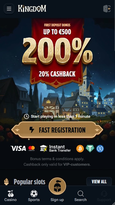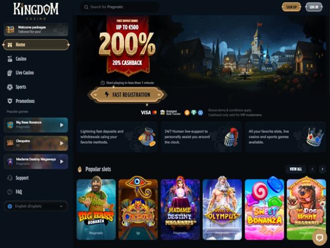 تأسس كازينو "كينغدوم" عام ٢٠٢٥، وهو موقع مراهنات حديث يرحب باللاعبين من كندا وألمانيا والنمسا وسويسرا. يقدم الكازينو مجموعة متنوعة من الألعاب، بما في ذلك ماكينات القمار بأموال حقيقية، وألعاب الموزع المباشر، وألعاب الطاولة، وألعاب الانهيار الفوري. كما سيتمكن اللاعبون من الوصول إلى مجموعة واسعة من خيارات المراهنات الرياضية، بالإضافة إلى خطة ترويجية صغيرة تتضمن بعض المكافآت.