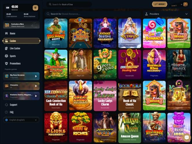Madame Destiny Megaways ، Big Bass Bonanza، Book of Ra Classic، Great Rhino Megaways، Amazon Queen، Immortal Romance، Cleopatra، Fishin' Frenzy، Energy Coins، Sugar Rush، Wolf Gold، Wanted Dead or a Wild، 9 Masks of Fire، Rise of Olympus 100، Book of Gold Multichance، Razor Shark، Mustang Gold، Reactoonz 2، Jammin' Jars 2، Le Pharaoh، Starlight Princess 1000، King Tusk، Chilli Heat Megaways، Fire in the Hole 2، Age of Conquest، وQuick Hit Sper Wheel Wild Red.