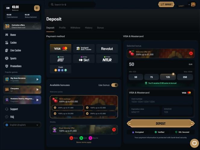 هنا، يمكن للاعبين استخدام العديد من طرق الدفع لإيداع وسحب الأموال من حساباتهم في الكازينو، بما في ذلك فيزا ، وماستركارد ، وأمريكان إكسبريس ، وأستروباي ، وسكريل ، ونتلر ، وباي سيف كارد ، وريفولوت . بالإضافة إلى ذلك، يمكن للاعبين استخدام العديد من العملات المشفرة لإدارة أموالهم، ومن بين الخيارات المتاحة: بيتكوين ، وبيتكوين كاش ، وكاردانو ، وداش ، ودوجكوين ، وإيثريوم ، ولايتكوين ، وسولانا ، وترون ، و USD Coin ، وتيثر ، وريبل ، وزد كاش .