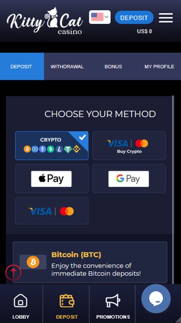 إذا لم تكن على دراية كبيرة بإيداعات العملات المشفرة، فتأكد من مراجعة قسم دليل العملات المشفرة، حيث يتم وصف جميع خطوات هذه العملية ببساطة وشرحها بأفضل طريقة ممكنة لكيفية إجراء معاملات العملات المشفرة بسهولة في Kitty Cat Casino.