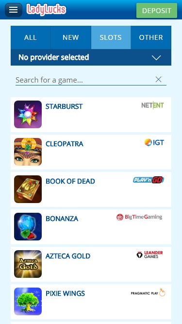 كازينو ليدي لوكس مدعوم من Microgaming, Net Entertainment, Barcrest, Big Time Gaming, ELK Studios, Genesis Gaming, lightningboxgames, Novomatic, Play'n GO, Quickspin, Rabcat, Relax Gaming, Thunderkick, Yggdrasil, Pragmatic Play, Felt Gaming, Red Tiger Gaming, IGT, FUGA Gaming, Games Global, 2by2 Gaming, Bally Technologies, Leander Games, Merkur Gaming, NextGen, Push Gaming, WMS, CORE Gaming, Scientific Games, Foxium, Betdigital and Just For The Win ، وتُقدم ألعابه عبر منصة ويب متوافقة مع الأجهزة المحمولة. تتوفر تطبيقات خاصة لأجهزة iPad وiPhone على متجر التطبيقات.