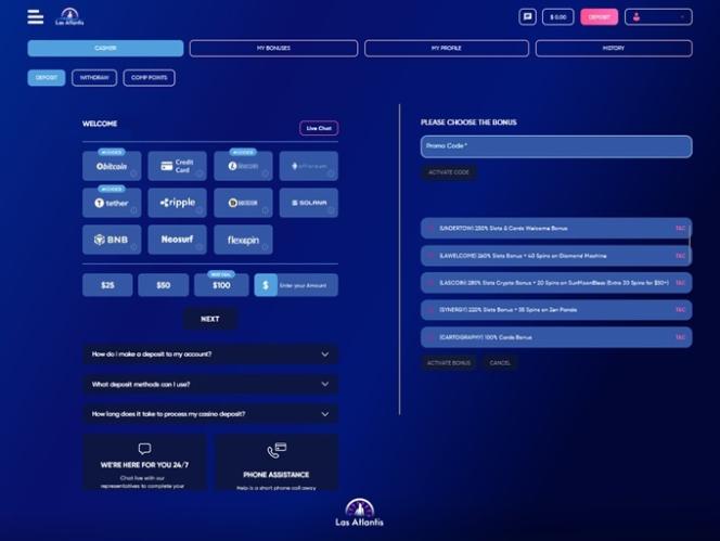 إن الشروط والأحكام في كازينو Las Atlantis هي معايير قياسية، ولا يوجد شيء يبرز بشكل غير عادل تجاه اللاعبين بقدر ما أستطيع أن أقول.ستجد أدناه خيارات الخدمات المصرفية المتنوعة في Las Atlantis، والتي تتضمن خيارات الإيداع والسحب المتنوعة.