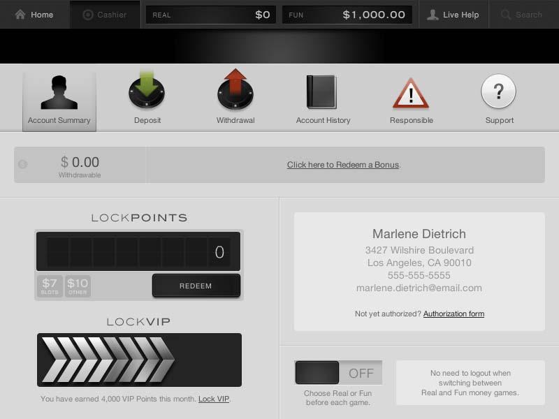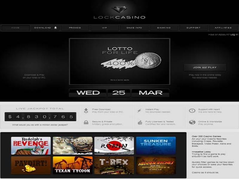 يقدم كازينو Lock نقطة مجانية واحدة مقابل كل 10 دولارات يتم الرهان عليها في الكازينو، مع منح الموقع دولارًا واحدًا نقدًا مقابل كل 100 نقطة يتم استردادها.معلومات الترخيص