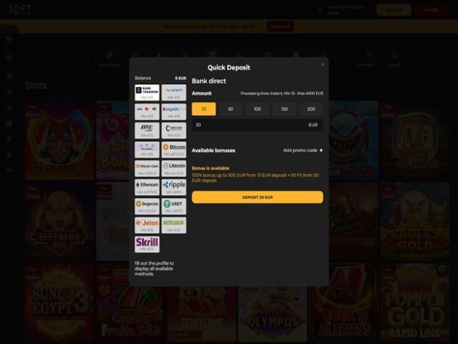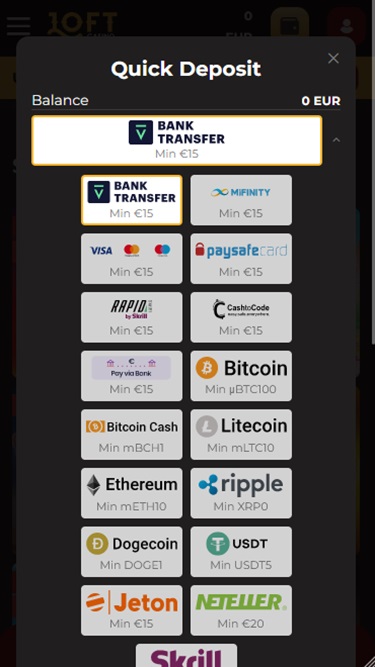 فيما يتعلق بالخيارات المصرفية، يمكن للاعبين استخدام طرق الدفع التقليدية مثل فيزا ، وماستركارد ، وسكريل ، ونتلر ، ونيوسيرف ، وغيرها. بالإضافة إلى ذلك، يتيح المشغل استخدام العملات المشفرة الحديثة لإجراء معاملات أسرع وأكثر سرية. يمكنك استخدام هذه العملات: بيتكوين ، وبيتكوين كاش ، ودوجكوين ، وإيثريوم ، ولايتكوين ، وتيثر ، وريبل.