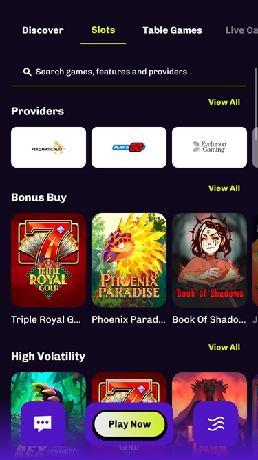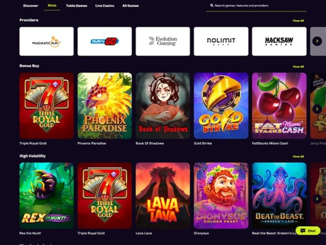 سيجد اللاعبون أنفسهم مُباشرةً أمام مكتبة ضخمة من ألعاب الكازينو الشيقة. إذا كنت من محبي استكشاف ألعاب جديدة كلما سجلت دخولك، فستستمتع بتصفح جميع الخيارات المتاحة، بما في ذلك ماكينات القمار الإلكترونية، والموزعين المباشرين ، وألعاب الطاولة، وألعاب الاختراق.