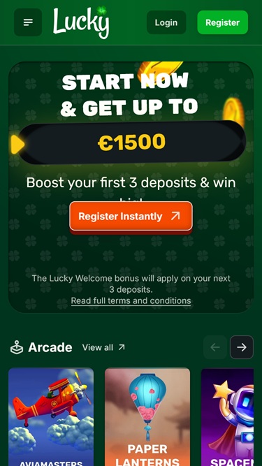 أخيرًا، استمتع بمئات ألعاب التحطيم الفورية المتوفرة على Lucky.co. ازدادت شعبية هذه الألعاب بفضل بساطتها وقواعدها المباشرة، ومن بين خيارات اللاعبين الشائعة: Aviamasters، وAviator، وPlinball Machine، وPaper Lanterns، وSpaceman، وSpaceXY، وKite Festival Crash Games، وSKyrocket.