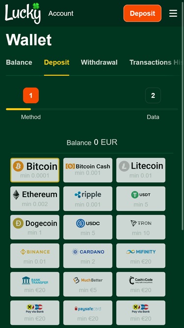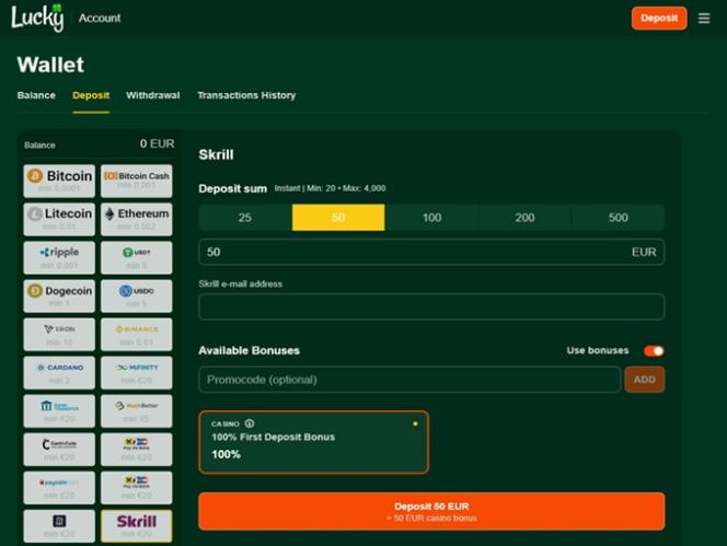 فيما يتعلق بطرق الدفع، تقدم العلامة التجارية مجموعة من الخيارات المصرفية لإدارة أموالك، بما في ذلك التحويل البنكي ، وAstroPay ، وSkrill ، و Neteller ، وMiFinity ، وRevolut ، و Paysafecard ، و MuchBetter . علاوة على ذلك، يقبل الكازينو العديد من العملات المشفرة كخيارات مصرفية أساسية، مثل Bitcoin ، وCardano ، وDogecoin ، وEthereum ، وLitecoin ، و Tron ، و USD Coin ، وTether ، و Ripple.