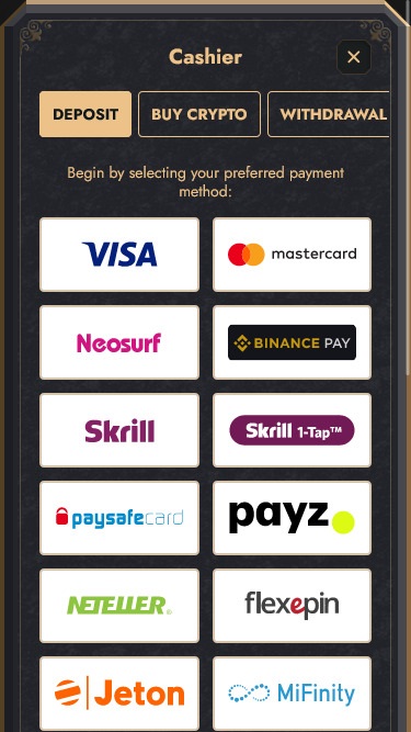 يوفر مشغل الكازينو للاعبين مجموعة واسعة من طرق الدفع التقليدية، مثل فيزا ، وماستركارد ، وسكريل ، ونتلر ، وأستروباي ، وباي سيف كارد . بالإضافة إلى ذلك، يمكن للاعبين اختيار استخدام العملات المشفرة مثل بيتكوين ، ولايتكوين ، وإيثريوم ، وتيثر ، وترون ، وريبل ، وسولانا ، ودوجكوين ، وغيرها.