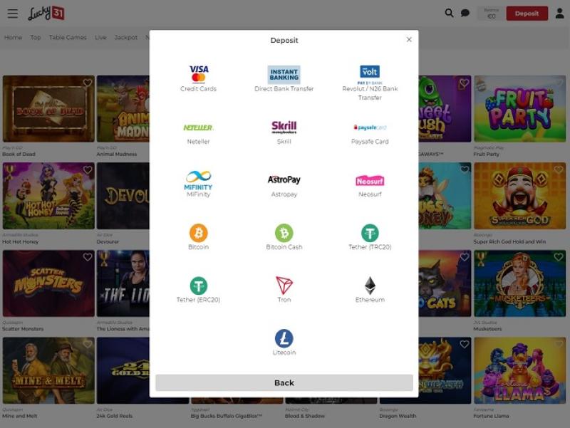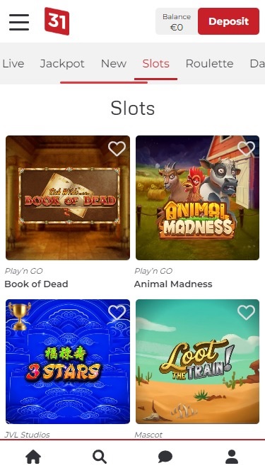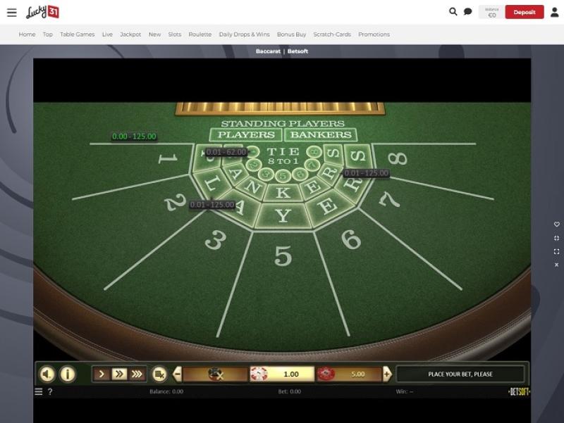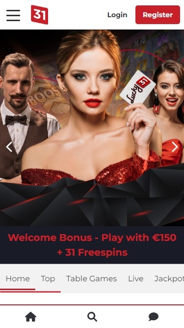 كازينو Lucky31 مدعوم من Net Entertainment, BetSoft, Evolution Gaming, Habanero Systems, iSoftBet, Oryx, Play'n GO, playson, Quickspin, Relax Gaming, Saucify, Thunderkick, Visionary iGaming, WM, Yggdrasil, Wazdan, GameArt, Booming Games, Stakelogic, Pragmatic Play, Nolimit City, Felt Gaming, Red Tiger Gaming, Booongo, Air Dice, LuckyStreak, Spinomenal, Fantasma Games, SYNOT Games, Revolver Gaming, Spinmatic, BGAMING, Evoplay, Electric Elephant Games, Bulletproof Games, Gluck Games, Mascot Gaming, Spearhead Studios, Swintt, Mancala Gaming, SmartSoft Gaming, Blue Guru Games, Lady Luck Games, Amusnet Interactive, CT Interactive, EveryMatrix, Push Gaming, Genii, Gamomat, Authentic Gaming, 4ThePlayer, AvatarUX, Gamevy, ReelPlay, Japan Technicals Games, Boomerang Studios, Hacksaw Gaming, Max Win Gaming, Bang Bang Games, Slotmill, Peter And Sons, Armadillo Studios, FlipLuck, Indigo Magic and Red Papaya ، وتُقدم ألعاب الكازينو عبر منصة ويب تتيح اللعب عبر متصفح الويب. كما يتوفر موقع للجوال، يتيح الوصول إلى الكازينو عبر الهاتف الذكي أو الجهاز اللوحي.Blackjack