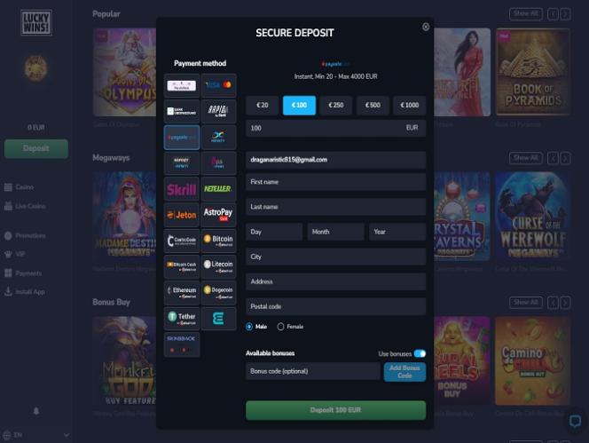 يتمتع كازينو LuckyWins بميزة كبيرة بفضل خياراته المصرفية الواسعة التي يمكن للاعبين استخدامها لعمليات السحب والإيداع. تشمل طرق الدفع الشائعة Skrill و Neteller و Visa وMastercard وNeosurf وPaysafecard وغيرها. من ناحية أخرى، سيسعد من يفضلون استخدام العملات المشفرة بمعرفة أنه يمكنهم القيام بذلك بسهولة باستخدام عملاتهم المشفرة: Bitcoin وEthereum وLitecoin وDogecoin وTether.