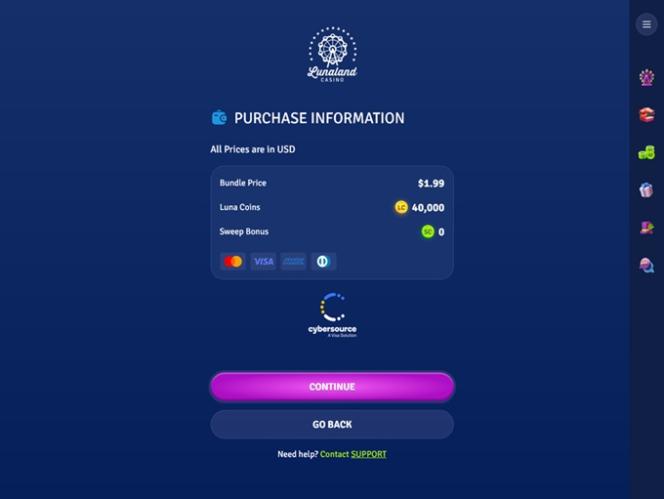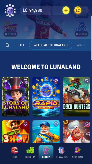 تمامًا كأي كازينو اجتماعي آخر، يقدم LunaLand مجموعة مميزة من العروض الترويجية والمكافآت. سيستمتع اللاعبون بالحصول على باقة ترحيبية ضخمة بعد إنشاء حساب، بالإضافة إلى العديد من المزايا الأخرى مثل مكافآت تسجيل الدخول اليومية، ولفات عجلة الحظ، وحوافز الولاء.