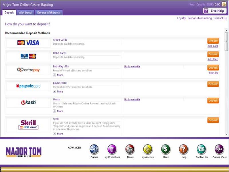 كازينو Major Tom مدعوم بـ Microgaming and Games Global ، الذي يوفر للاعبين مئات الألعاب، بالإضافة إلى منصة ممتازة يسهل عليهم استخدامها. يتميز Major Tom بمنصة ويب، بالإضافة إلى برنامج قابل للتنزيل يُحمّل جميع الألعاب مباشرةً على جهاز الكمبيوتر. كما يوفر موقع كازينو للهواتف المحمولة يتيح للاعبين اللعب عبر هواتفهم الذكية أو أجهزتهم اللوحية.خيارات الخدمات المصرفية في Major Tom Casino