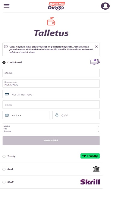 خيارات الخدمات المصرفية في MamaMia Bingo