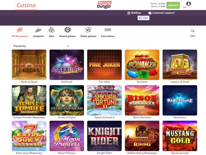 يتم إنتاج ألعاب الكازينو عالية الجودة عبر الإنترنت التي تقدمها MamaMia Bingo من قبل العديد من العلامات التجارية الشهيرة iGaming مثل: Evolution و Wazdan و Yggdrasil… تحتوي مكتبة الألعاب أيضًا على محتويات مبتكرة تم إنشاؤها بواسطة مطوري برامج الكازينو عبر الإنترنت الأصغر وبهذه الطريقة يقدم المشغل تنوعًا في اللعبة للاعبين.