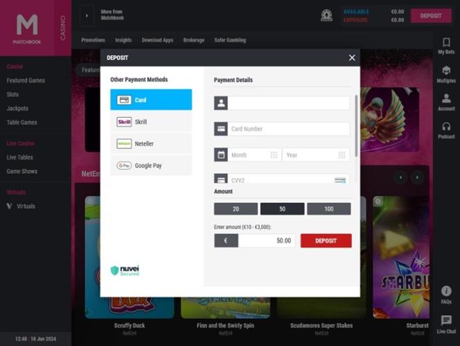بالإضافة إلى ألعاب الكازينو القياسية، يوفر Matchbook Casino أيضًا خدمات الموزع المباشر بالإضافة إلى قسم المراهنات الرياضية الكامل المذكور أعلاه، والذي يقبل الرهانات على كرة القدم وكرة السلة والبيسبول والتنس والكريكيت والرجبي وغير ذلك الكثير.مشاكل اللاعبين