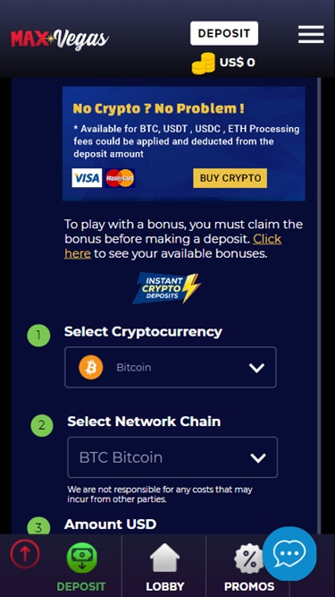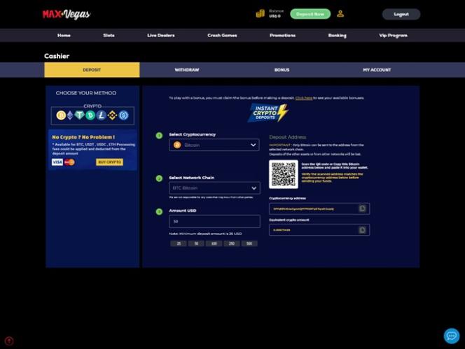 يضمن مشغلو كازينو ماكس فيغاس للاعبيهم استخدام العديد من العملات المشفرة المختلفة كطرق للإيداع والسحب. بيتكوين ، بيتكوين كاش، تيثر، إيثريوم، لايتكوين، دولار أمريكي، وباينانس كوين، جميعها متاحة للاستخدام هنا.