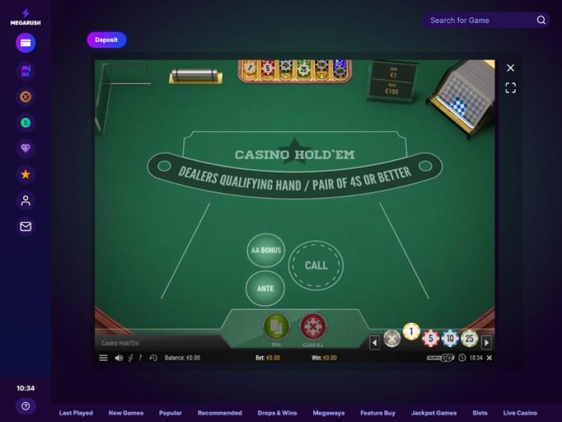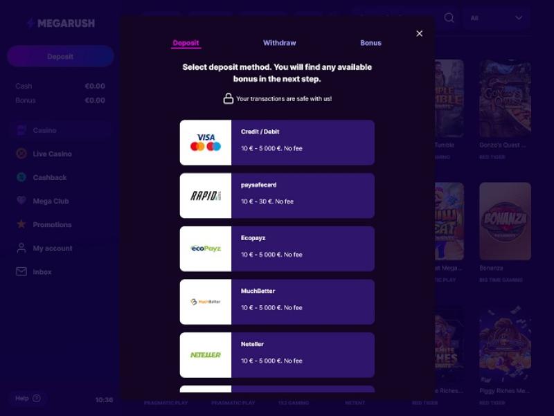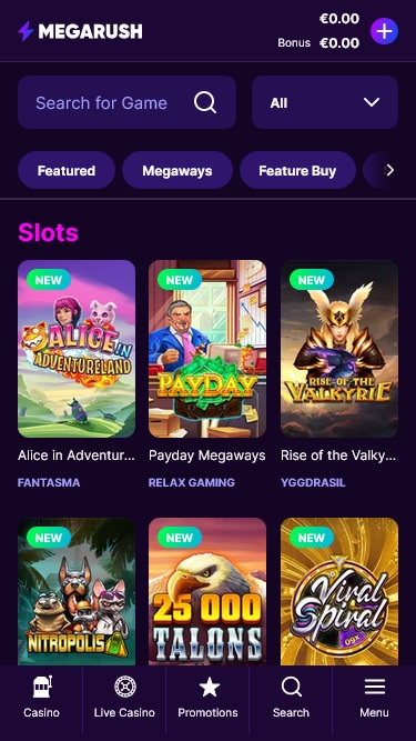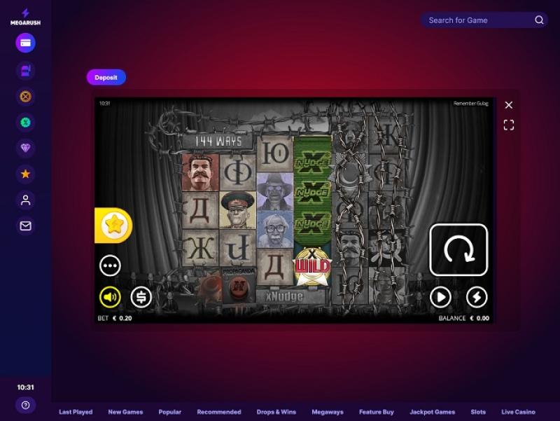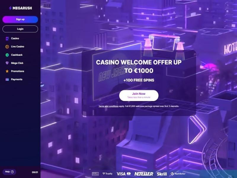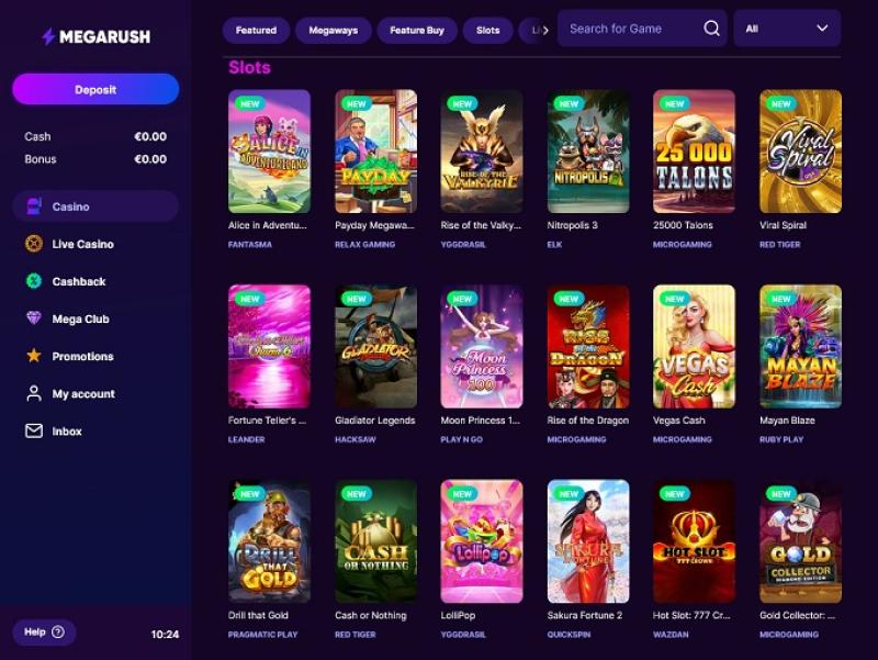 حتى للوهلة الأولى، سيُسحر MegaRush جميع لاعبي الكازينوهات الإلكترونية. منصة الكازينو عصرية، وتصميمها واضح وبسيط. أكثر ما يُعجبنا هو الفيديو القوي الذي يُشغّل تلقائيًا. الألوان الزرقاء الداكنة والنيون، والتصميم الجيد، والفئات المُنظّمة جيدًا، تُشكّل مزيجًا جذابًا بلا شك.